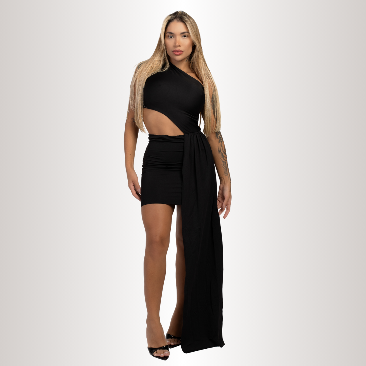 Vestido curto com design assimétrico e recorte estratégico na lateral, que valoriza a silhueta com um toque moderno e ousado. Possui detalhe drapeado e faixa longa que traz movimento e sofisticação. Ideal para produções noturnas cheias de atitude. ✨